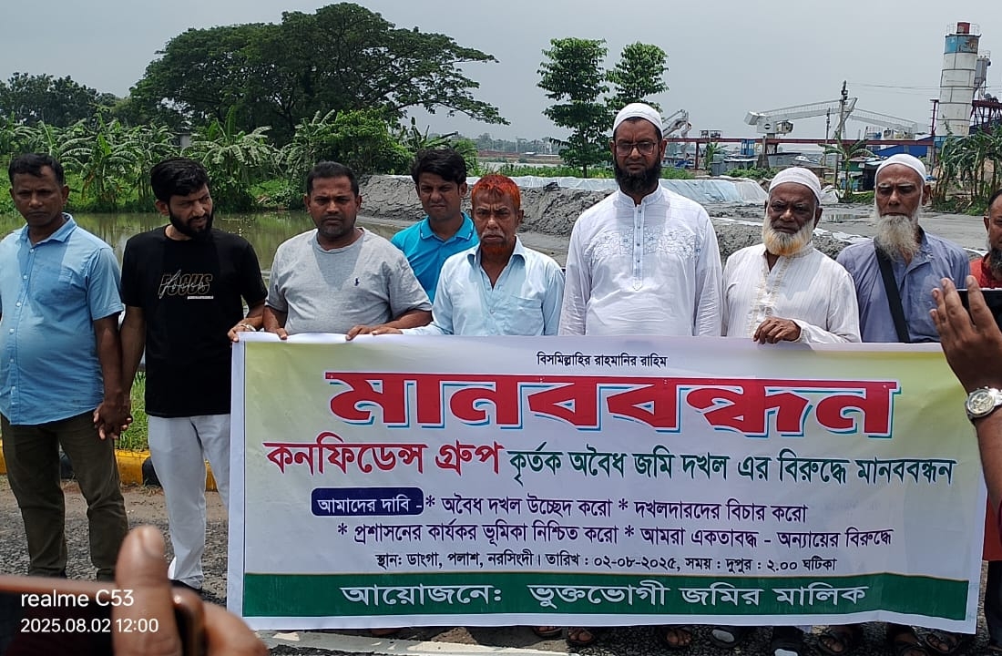 নরসিংদীর পলাশের ডাংগায় অবৈধভাবে বালু উত্তোলন করে ফসলি জমি ধ্বংস এবং ব্যক্তিগত জমি দখল করে বালু ভরাটের প্রতিবাদে মানববন্ধন করেছেন এলাকাবাসী।