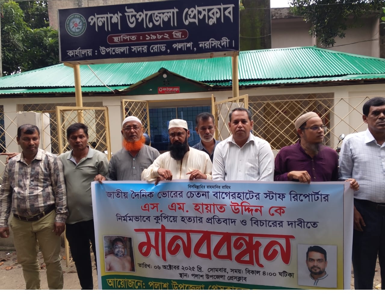 মানববন্ধনে পলাশ উপজেলা প্রেসক্লাবের সকল সাংবাদিকবৃন্দ উপস্থিত ছিলেন। বক্তারা এ সময় বলেন, একজন পেশাদার সাংবাদিককে দিনের আলোয় এভাবে নৃশংসভাবে হত্যা সাংবাদিক সমাজের জন্য চরম অশনি সংকেত। তারা বলেন, “সাংবাদিক হায়াত উদ্দিনের রক্ত বৃথা যেতে পারে না। অবিলম্বে হত্যাকারীদের গ্রেপ্তার করে দৃষ্টান্তমূলক শাস্তির আওতায় আনতে হবে।”