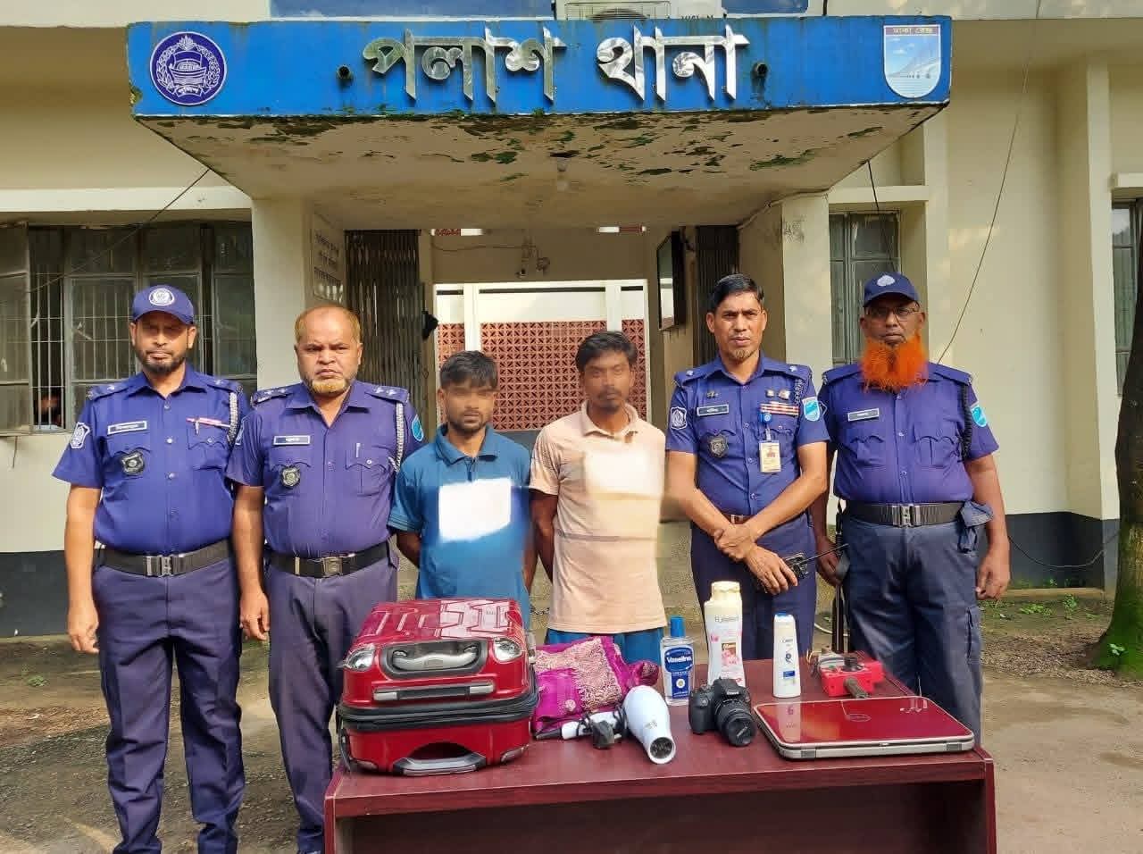 নরসিংদীর পলাশে এক প্রবাসীর বাড়িতে চুরির ঘটনায় লাবন মিয়া ও রানা মিয়া নামে দুই চোরকে গ্রেফতার করেছে পুলিশ। এসময় তাদের কাছ থেকে চুরি হওয়া একটি ল্যাপটপ, একটি ক্যামেরা, কিছু বিদেশী প্রসাধনী ও জামাকাপড়সহ মালামাল উদ্ধার করা হয়। গতকাল রাতে উপজেলার ডাঙ্গা ইউনিয়নের ইসলাম পাড়া গ্রামে অভিযান চালিয়ে তাদের গ্রেফতার করা হয়। গ্রেফতারকৃত লাবন মিয়া ওই গ্রামের নয়ন মিয়ার ছেলে ও রানা মিয়া একই গ্রামের মোন্তা মিয়ার ছেলে।