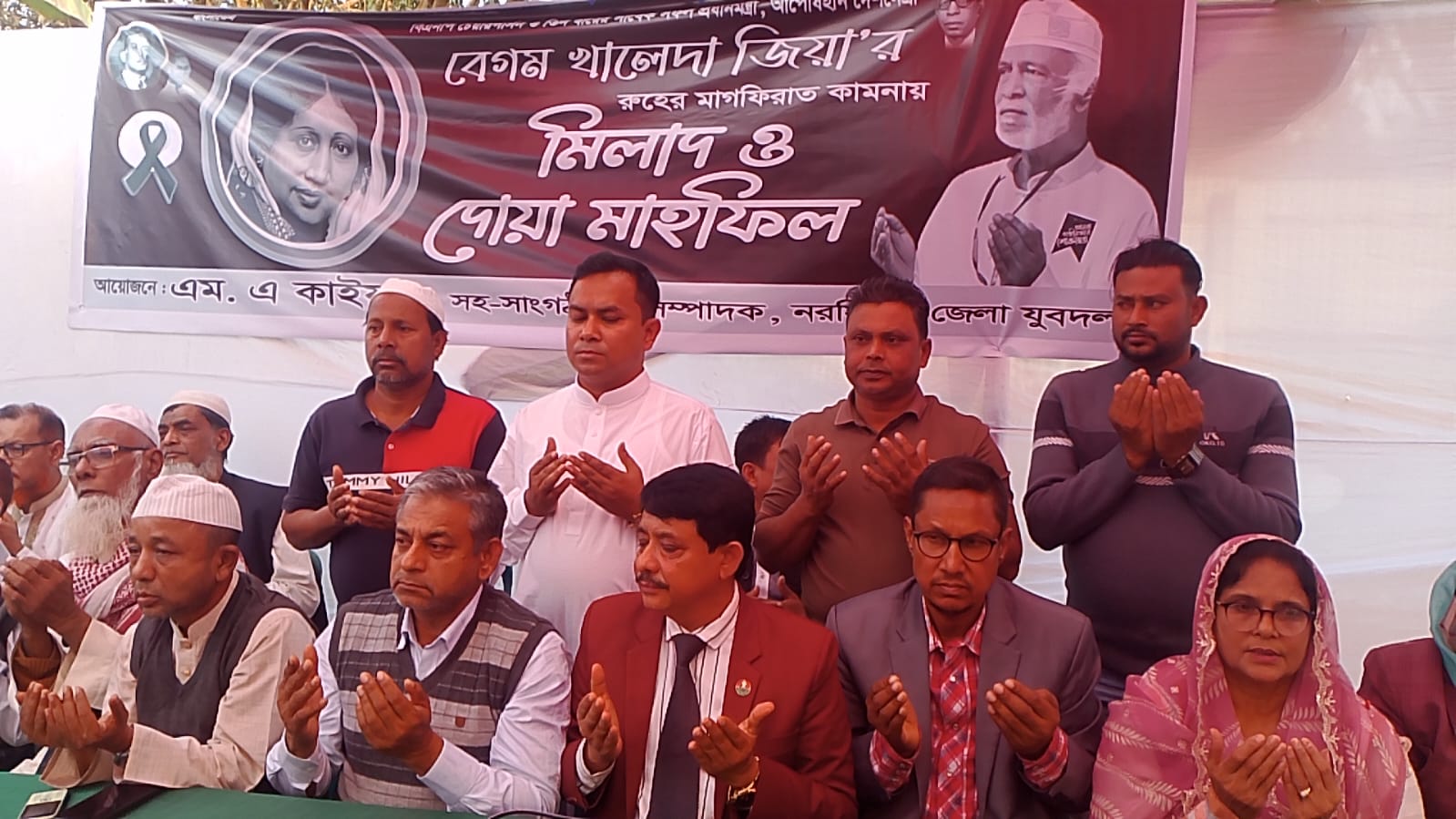 নরসিংদীর জেলা যুবদলের সহ সাংগঠনিক সম্পাদক এম এ কাইয়ুমের আয়োজনে বিএনপি সাবেক চেয়ারপার্সন ও সাবেক প্রধানমন্ত্রী মরহুমা বেগম খালেদা জিয়ার রুহের মাগফেরাত কামণা করে বিশেষ দোয়া মোনাজাত ও স্মরণ সভা অনুষ্ঠিত হয়েছে। আজ শনিবার দুপুরে উপজেলার ডাঙ্গা ইউনিয়নের জয়নগর গ্রামে যুবদল নেতা কাইয়ুমের নিজ বাড়িতে এই স্মরণ সভা ও দোয়া মোনাজাত অনুষ্ঠিত হয়।